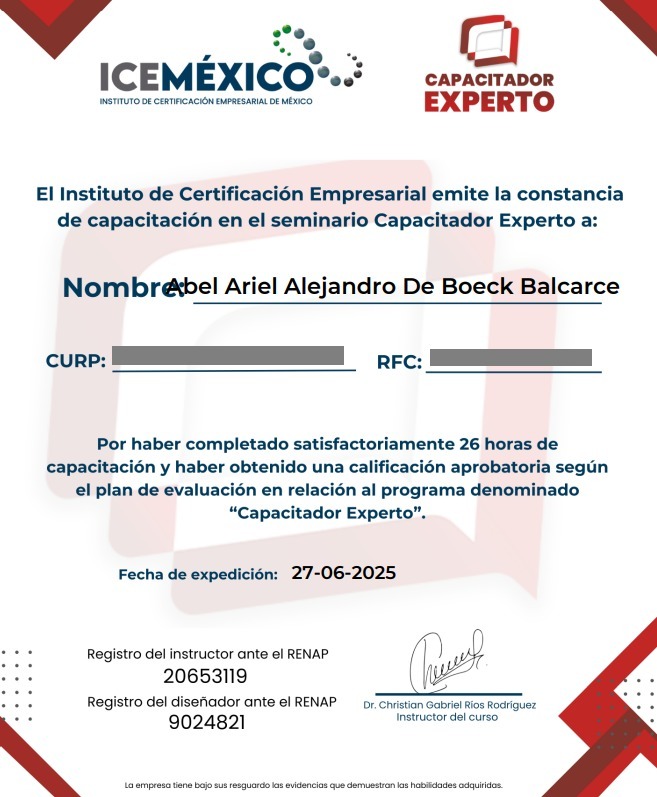 Nuestro fundador, Abel Ariel A. De Boeck Balcarce, es un profesional altamente calificado con títulos en Máster in Business Administration, Máster en Alta Dirección Empresarial y licenciaturas en Higiene y Seguridad en el Trabajo. Su vasta experiencia en el sector salud, educación y deportivo, junto con su enfoque en formación profesional, lo convierten en un referente en el ámbito de la capacitación y desarrollo.